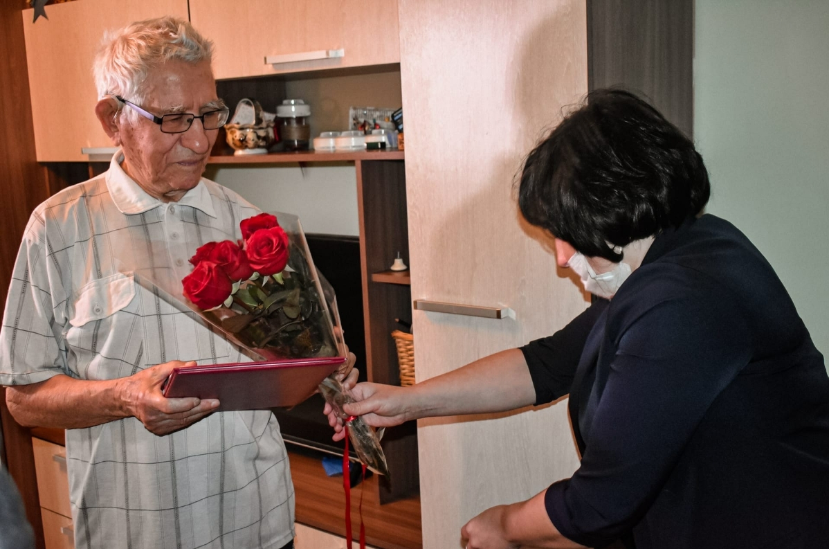 Юбиляру вручили поздравительную открытку, цветы и подарки.