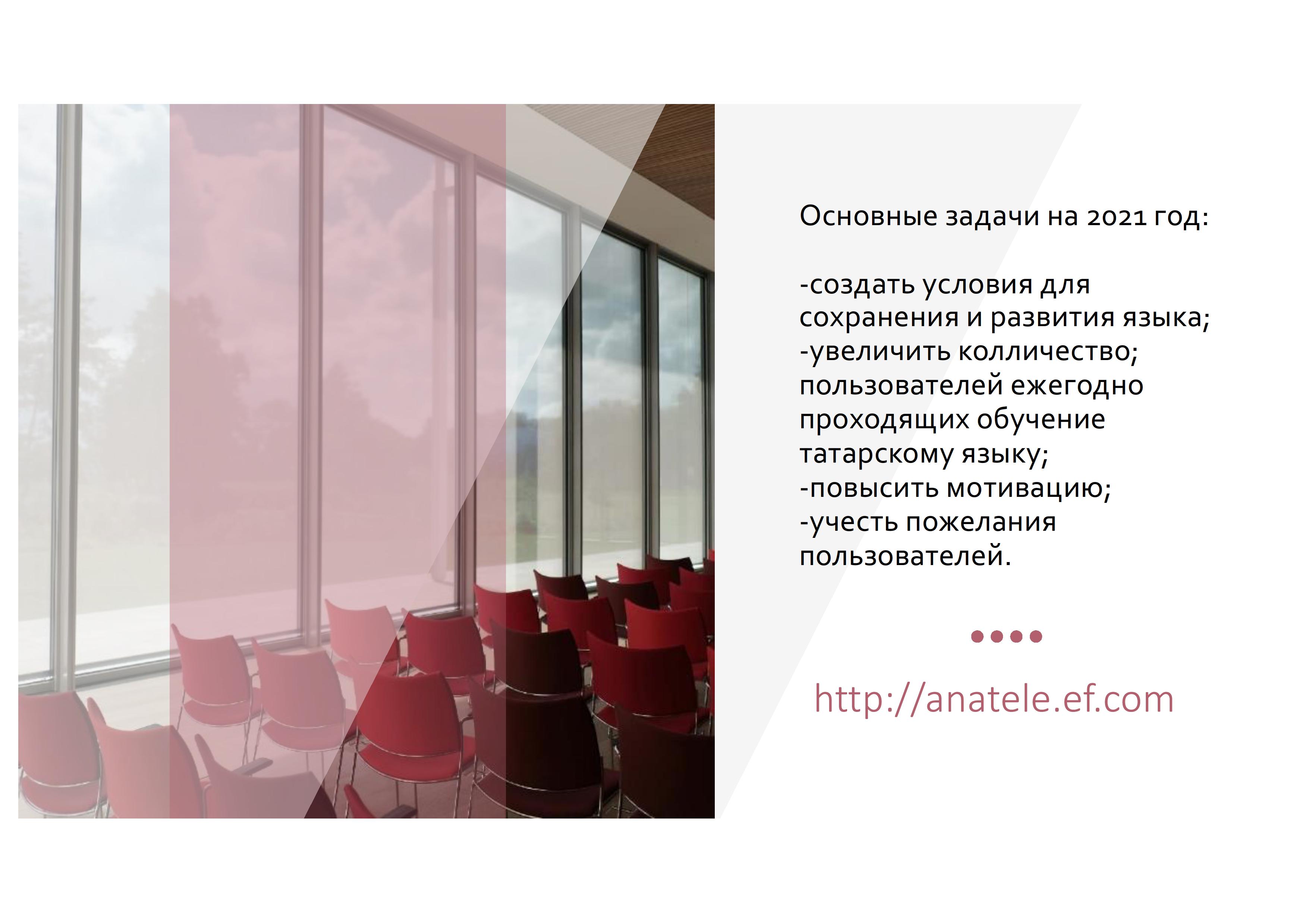 В соответствии с поручением Президента Республики Татарстан Р.Н. Минниханова с 2013 года функционирует уникальный проект дистанционного обучения татарскому языку «Ана теле», который предоставляет возможность повышения уровня практического владения татарским языком как средством речевой коммуникации. Проект «Ана теле» нацелен на обучение татарскому языку всех желающих, проживающих как в Республике Татарстан, так и за рубежом. Обучение бесплатно и доступно на трех языках (английский, татарский, русский).