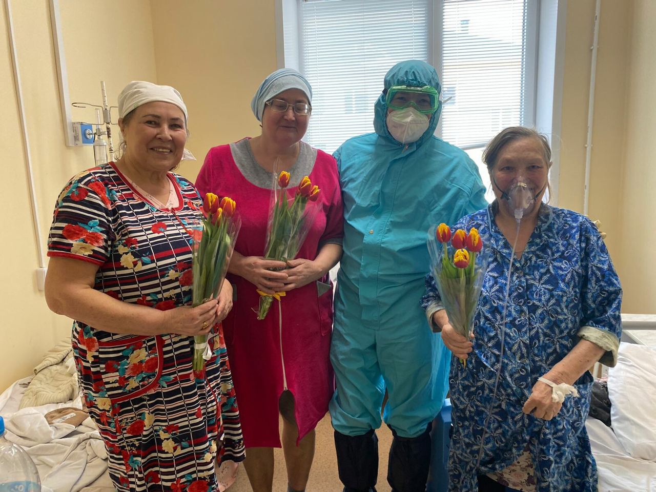 Пациенты ковид-госпиталя Пестрецов получили цветы на 8 Марта от главы района Ильхама Кашапова.
