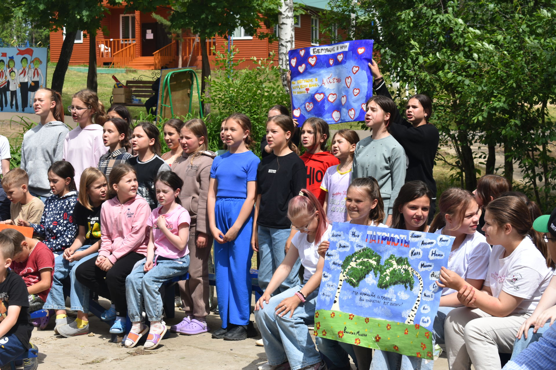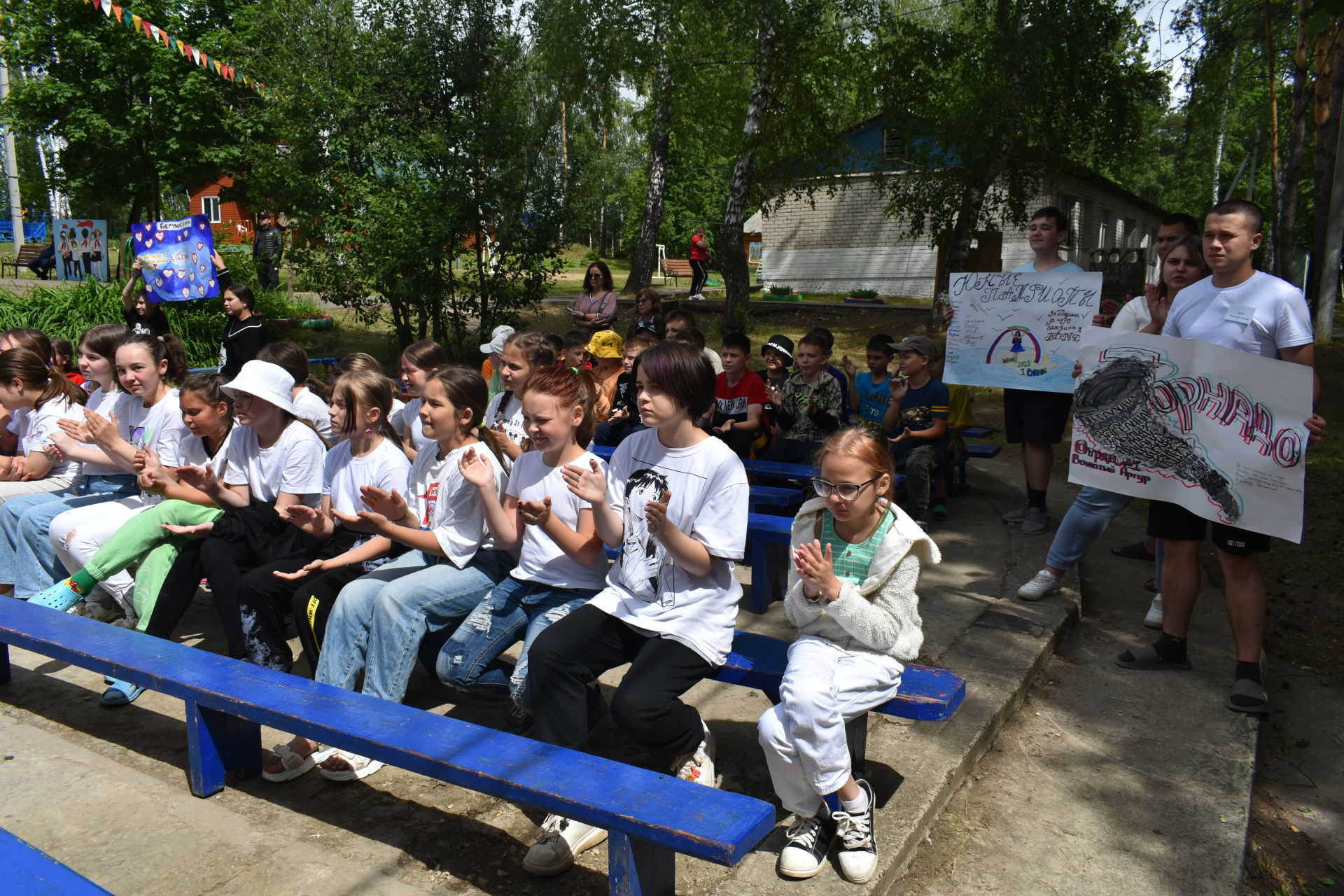 В лагере сейчас отдыхают дети от 7 до 13 лет, разделенные на 5 отрядов. Заехали они неделю назад, 17 июня. Отмечается, что большая часть мероприятий с ними направлена на патриотическое воспитание и прививанию любви к Родине. Подъем у ребят в 7 утра, зарядка, завтрак, потом проходит линейка с поднятием государственного флага России и включением гимна. Затем настает время занятий.