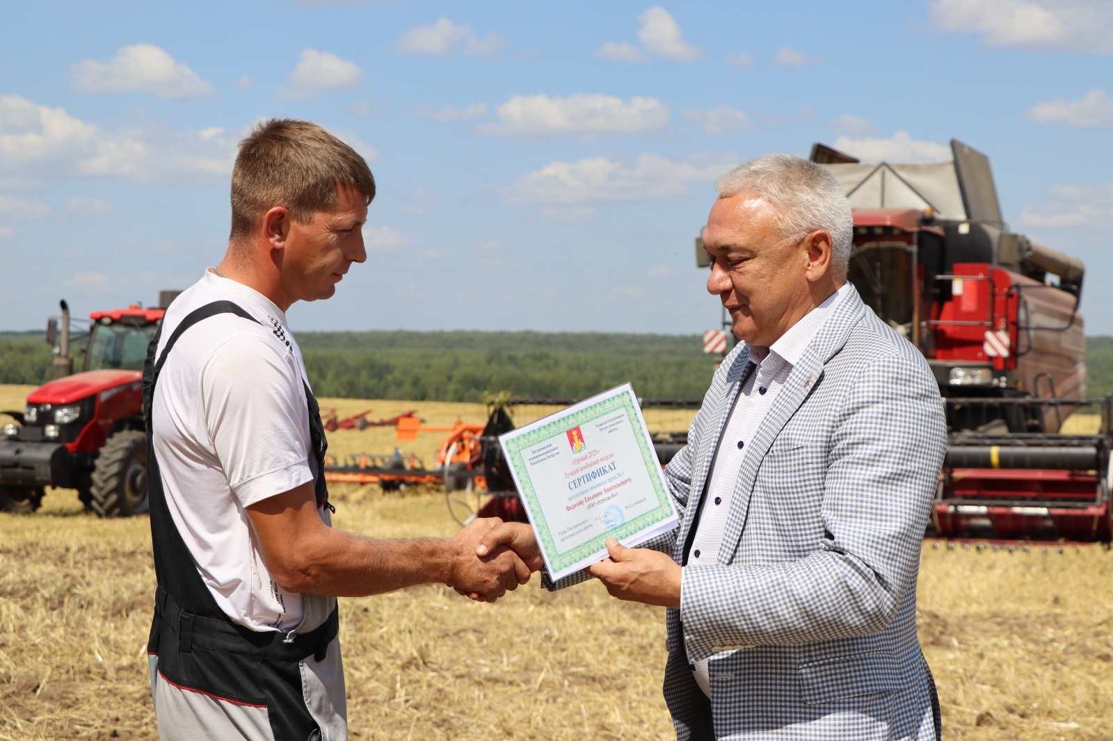 Евгений – потомственный комбайнер, более 20 лет трудится в сельском хозяйстве. Поздравили и вручили денежный сертификат прямо на поле - во время обеденного перерыва. Работники культуры организовали аграриям небольшой концерт.