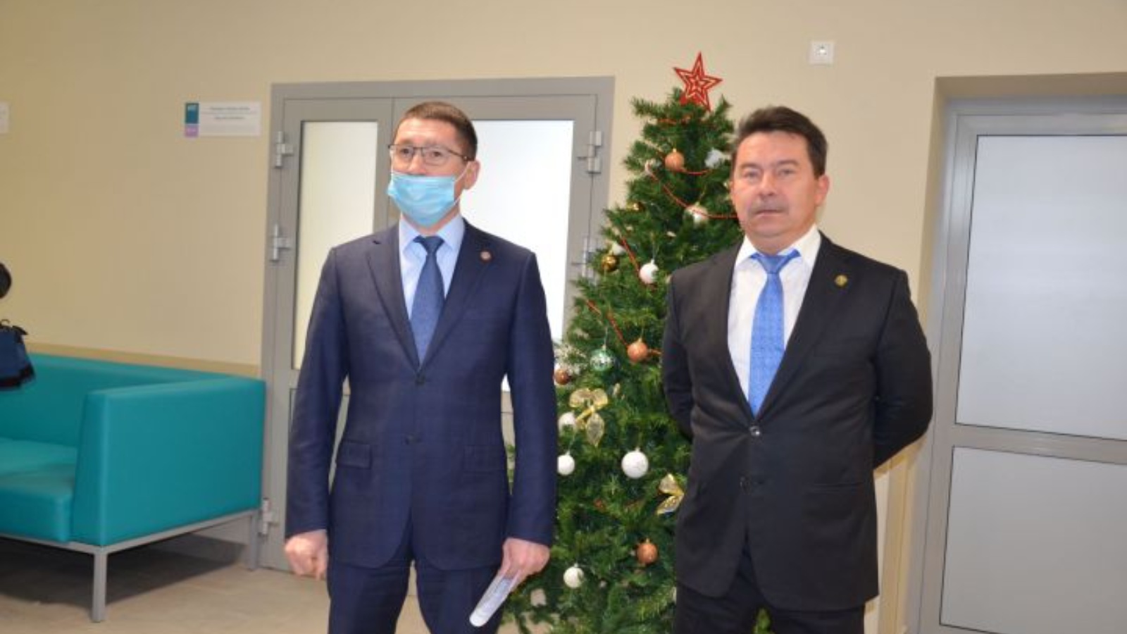 Чараның рәсми өлеше алдыннан район башлыгы Илһам Кашапов һәм Сәламәтлек саклау министры Марат Садыйков яңа табиблык амбулаториясен карадылар.